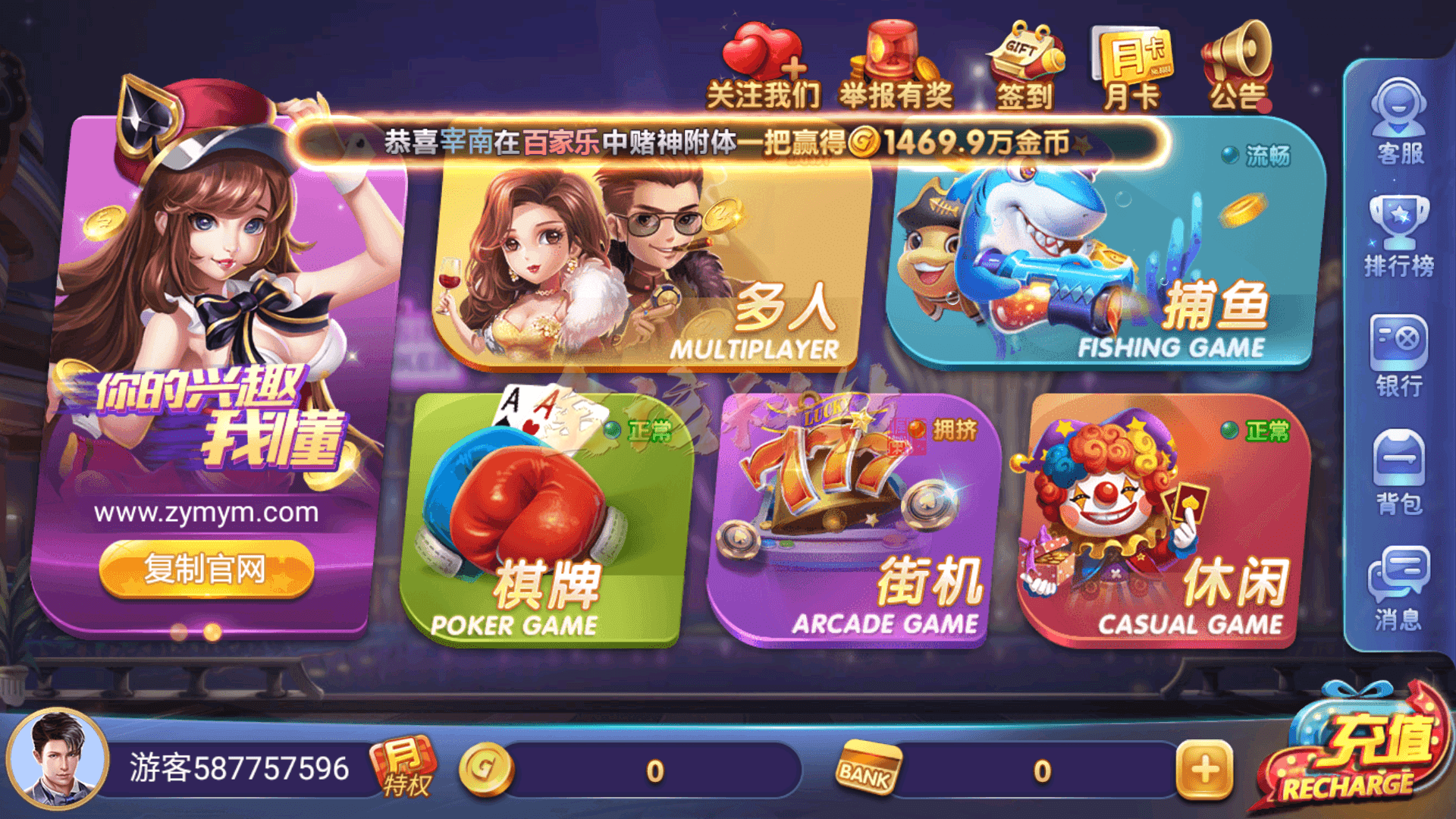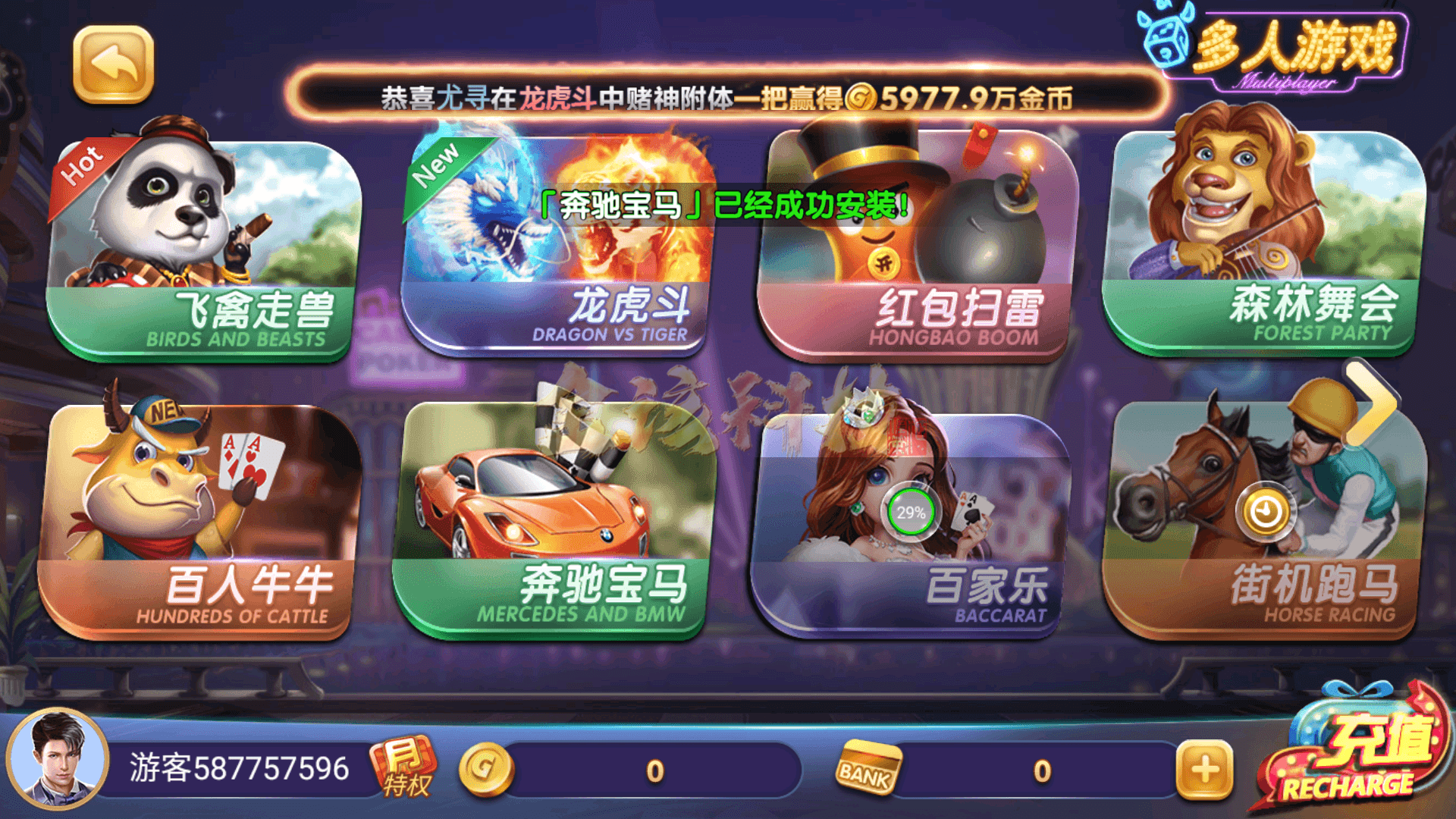 多人游戏:百人牛牛,龙虎斗,森林舞会(二代新),红包扫雷,百家乐,飞禽走兽,奔驰宝马,街机跑马,摇一摇